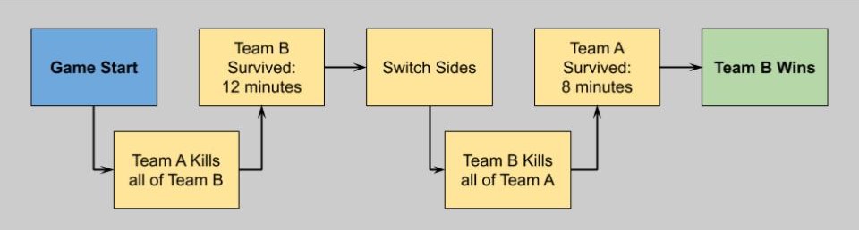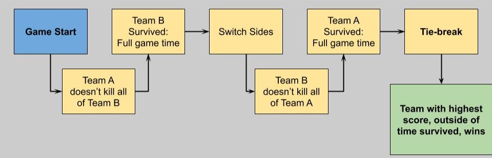 In each round, for a total of 2 rounds, teams take on the role of either Assassin or Survivor. The game is won by the team who survives the longest amount of time while playing as the Survivors. The Assassin team works together to hunt down the Survivors. The game is played on an extremely dark map. The Assassin team are afforded a better sense of surrounding/ability to traverse in the dark (night-vision goggles, strong flashlight, etc), whereas the Survivors are mostly unaided in their ability to navigate the darkness. Teams consist of 20 players.